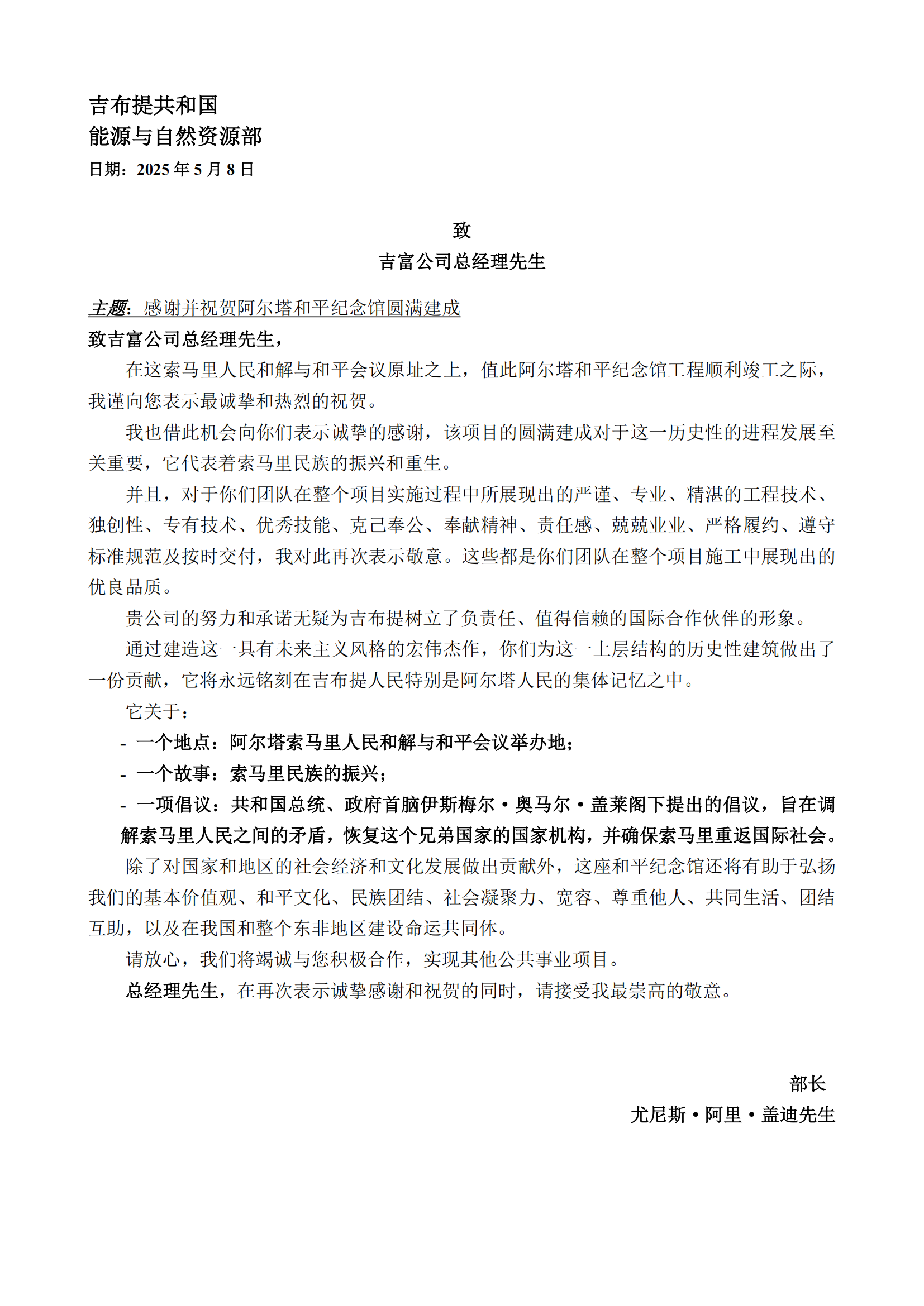 蓋迪部長特別指出,寶業(yè)吉富公司以嚴謹、專業(yè)、精湛的工程技術,獨創(chuàng)且優(yōu)秀的專業(yè)技能,兢兢業(yè)業(yè)的工作態(tài)度,順利完成項目的如期交付,完美詮釋了作為優(yōu)秀國際合作伙伴的責任與擔當。這座凝聚和平愿景的紀念館,不僅是吉布提與索馬里民族振興的重要象征,更成為東非地區(qū)團結(jié)互助、共建命運共同體的實體見證,項目建成將有效促進區(qū)域和平教育、文化交流,有力推動區(qū)域和平穩(wěn)定與社會經(jīng)濟發(fā)展。
